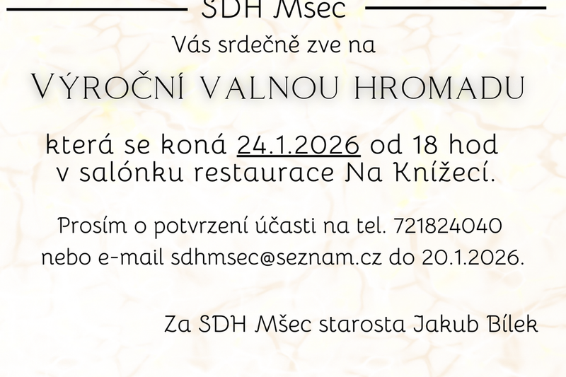 SDH Mšec vás srdečně zve na tradiční hasičský ples, který se koná 21.2. 2026 v kulturním zařízení ve Mšeci. K tanci a poslechu bude hrát skupina Dlouhá noc. Tombola a občerstvení zajištěno. Vstupenky je možné zakoupit na obecním úřadě u paní Bílkové. Cena 200kč. Všichni jste srdečně zváni.