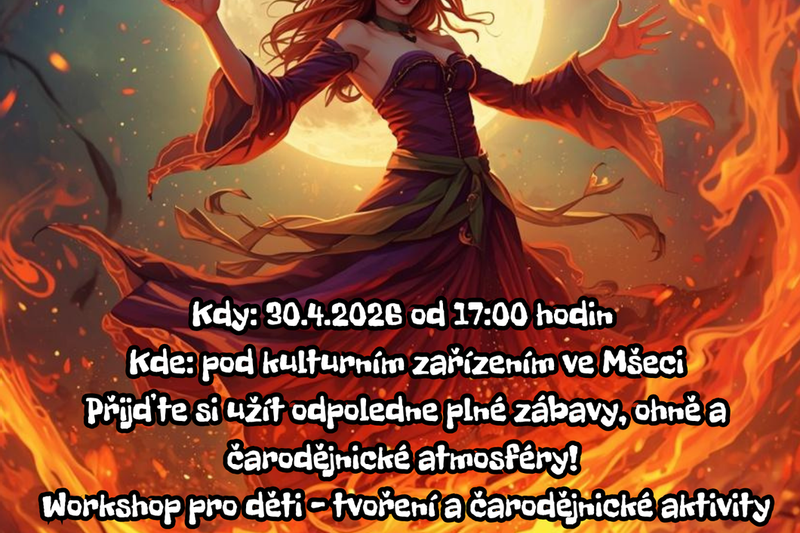 Sbor dobrovolných hasičů Mšec vás srdečně zve na tradiční pálení Čarodějnic 30. 4. 2026 od 17:00 pod kulturním zařízení ve Mšeci. Občerstvení zajištěno. Těšte se na ohnivou šou.