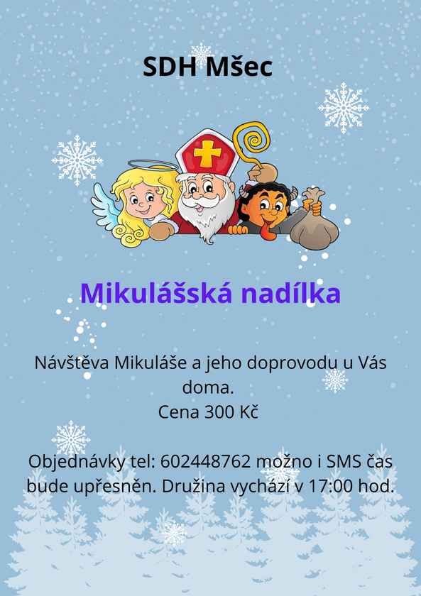 Návštěvu Mikuláš a jeho družiny si můžete objednat na tel. 602448762. Družina vychází v 5.12.2025 od 17:00.